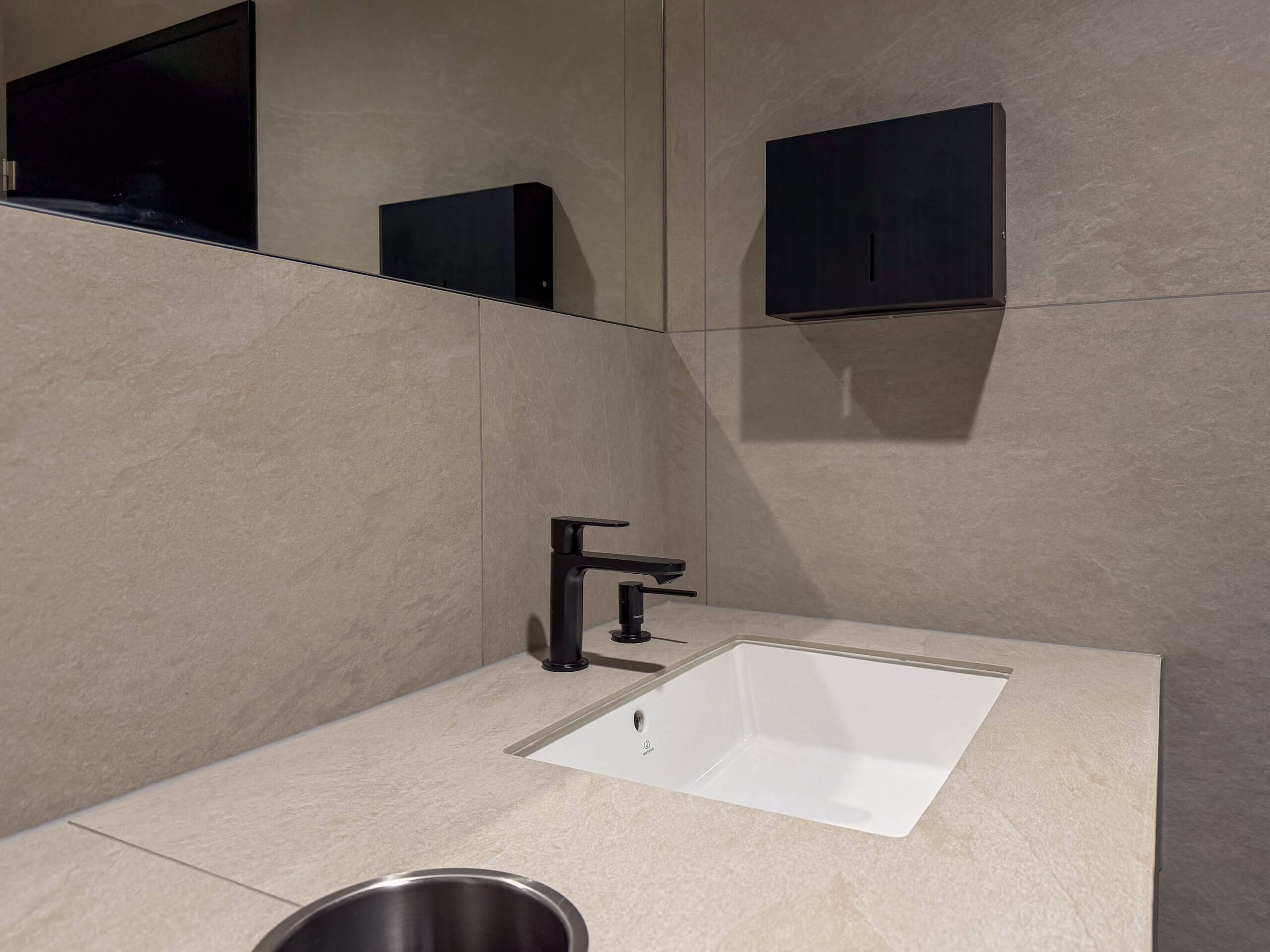 Umyvadlová deska je obložena stejným materiálem jako stěny a plynule na ně navazuje. Zrcadlo je vloženo přímo do obkladu, což dále podporuje minimalistický charakter prostoru. Zapuštěná umyvadla, integrované dávkovače mýdla i baterie a koš na použité papírové ručníky skrytý v umyvadlové desce přispívají k maximální čistotě řešení. Veškeré zařizovací předměty jsou navrženy v černé barvě, která interiéru dodává jemný kontrast a podtrhuje jeho elegantní výraz.